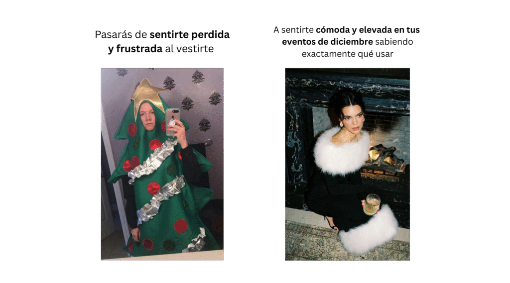 DICIEMBRE S.O.S. nació porque, durante años, me frustraba vestirme para mis eventos de diciembre. Compraba ropa que nunca volvía a usar, veía inspiración en redes sociales que no funcionaba para mi cuerpo ni mi clima, y sentía que cada compra era un riesgo. También observé la frustración de amigas, familiares y clientas, muchas de las cuales evitaban reuniones por estrés con su outfit. Por eso decidí crear una guía práctica y completa, para que en un mes caótico como diciembre, tus outfits no sean un problema, sino una oportunidad de brillar con autenticidad y disfrutar de lo más importante: los momentos con quienes amas ya estando relajada y feliz porque tus looks están resueltos.